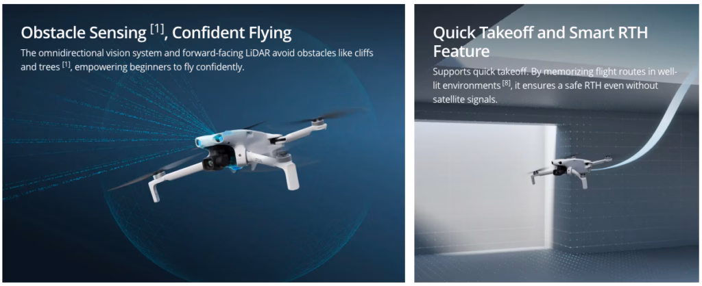 - Omnidirectional obstacle sensing system enhanced by forward-facing LiDAR ensures precise detection and worry-free flights in complex environments